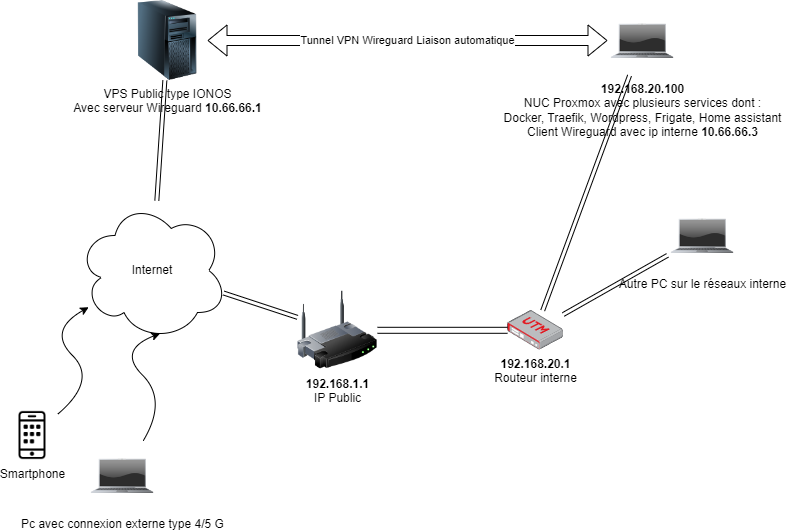 Dans ce schéma, nous comprenons que la liaison entre le VPS public et mon serveur interne stocké sur une VM Debian (géré par Proxmox) est automatique et résiliente, cette liaison me permet de « traverser » mon modem (Free) et mon routeur (UDM SE)